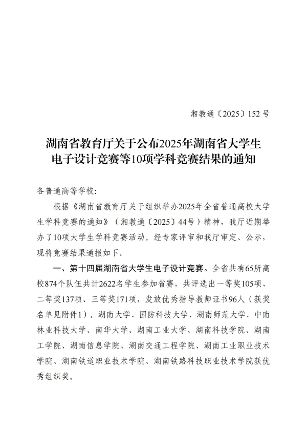(转发)湖南省教育厅关于公布2025年湖南省大学生电子设计竞赛等10项学科竞赛结果的通知