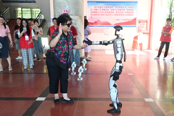 ▲ 机器人与新生家长握手