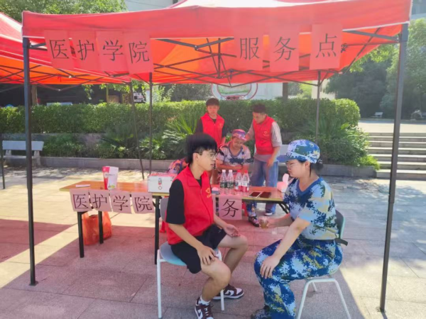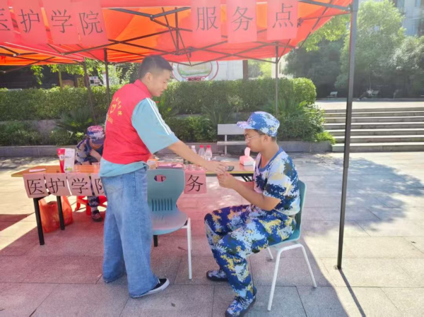 近日,医学技术与护理学院携手校医务室在2025级新生军训场地专门设立志愿服务点,组织志愿者发挥专业特长,为参训新生提供全程医疗支持和暖心服务,全力保障军训工作顺利开展。