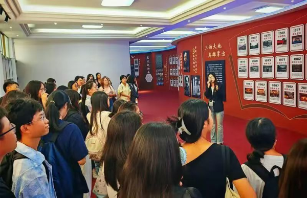 活动现场,2023级学生钟敏担任讲解员。她以饱满的热情和生动的语言,依托展馆内丰富的图文史料,围绕“光辉历程”“三湘群英”“衡阳记忆”三大主题篇章,系统讲述了中国共产党从一大到二十大的历次代表大会的召开背景、重要内容与深远意义,并深情回顾了水口山工人运动、衡阳保卫战等重大历史事件中革命先辈们的英勇事迹。在“交院传承”篇章中,她引领同学们共同回顾学校砥砺前行的发展历程和令人振奋的辉煌成就,重点介绍了学校在人才培养、教育教学、科学研究以及社会服务等方面取得的突出成果。通过她详实而生动的解说,新生们不仅深切体会到今日美好生活的来之不易,也更直观地感受到学校深厚的文化底蕴与蓬勃的发展势头,进一步坚定了理想信念,增强了爱国爱校的情怀和奋发成才的使命感。