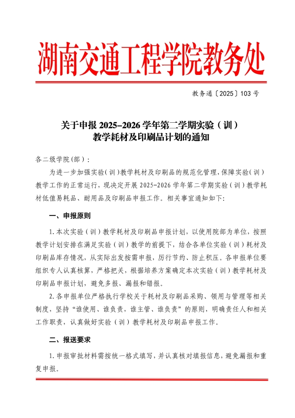 关于申报2025-2026学年第二学期实验(训)教学耗材及印刷品计划的通知