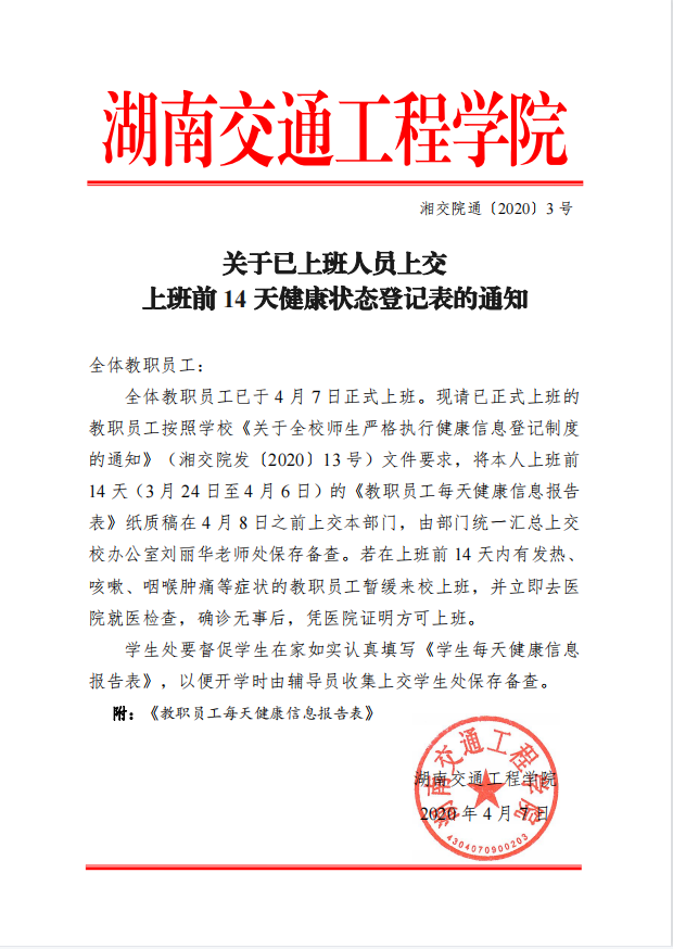 关于已上班人员上交上班前14天健康状态登记表的通知