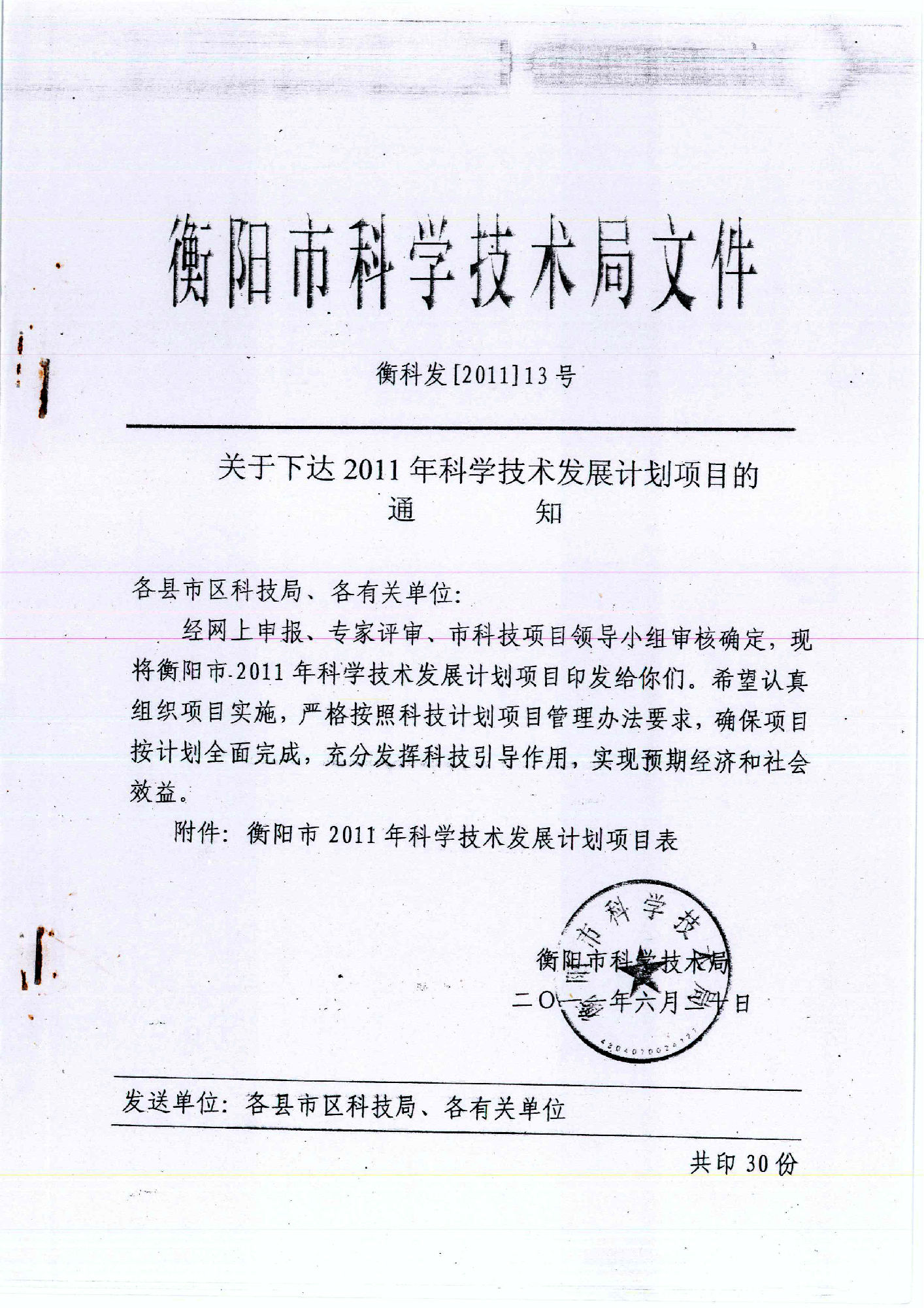 2011年衡阳市科学技术发展计划项目通过名单