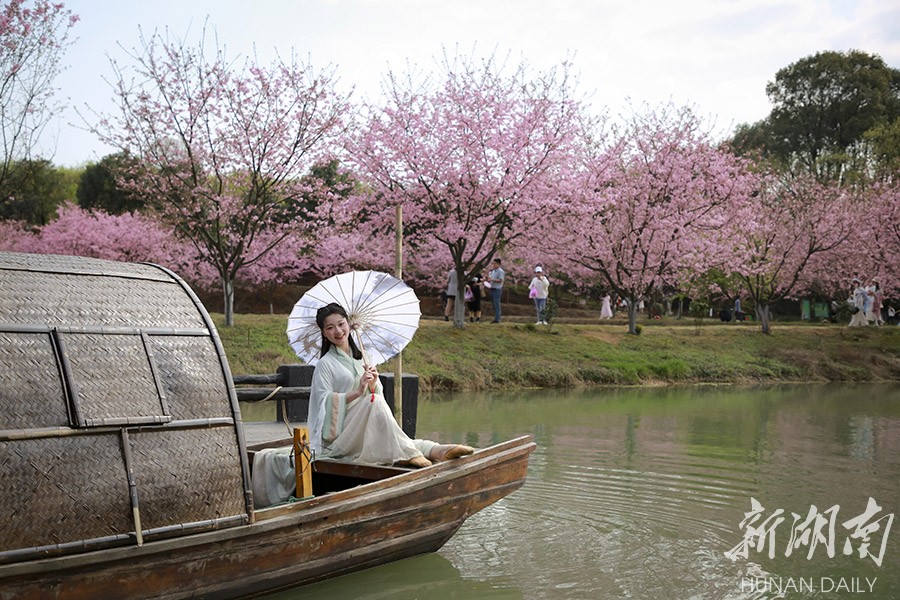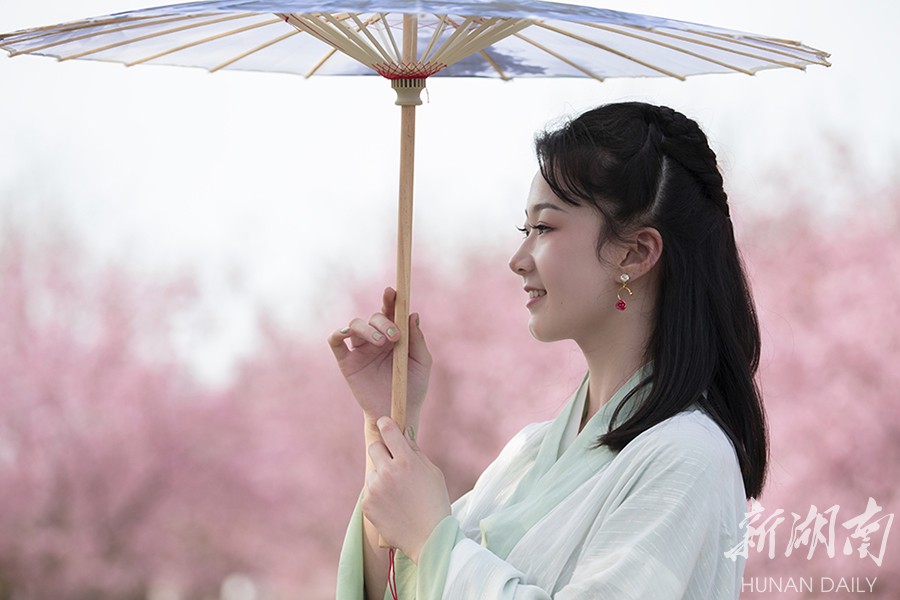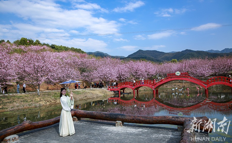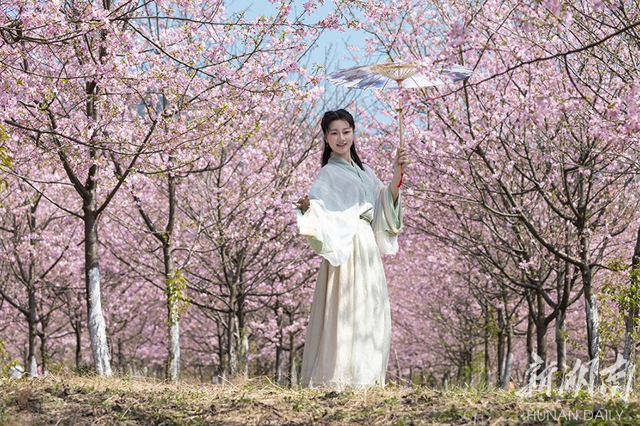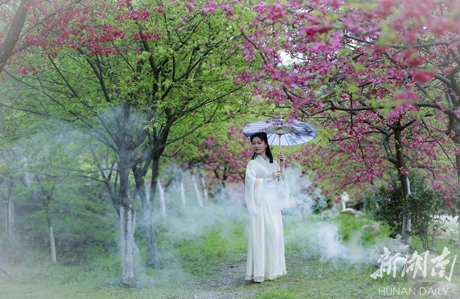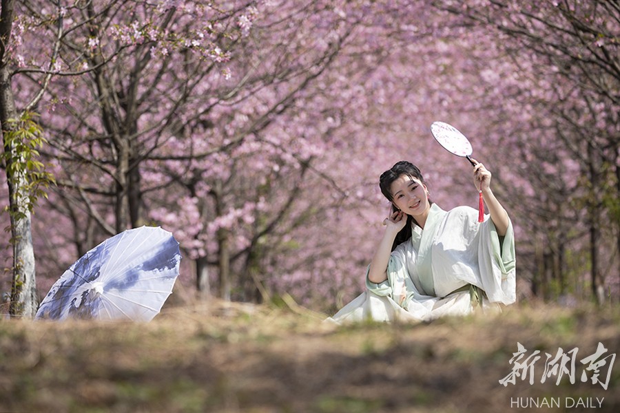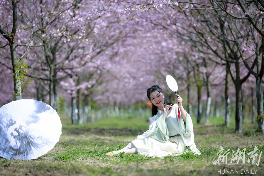 3月13日,常宁百万樱花园内,樱花盛开,景美如画。bevictor伟德官网人文与艺术学院音乐表演系大学生来到这里开展社会实践活动,锻炼表演基本功,一展模特风采。李琼 摄