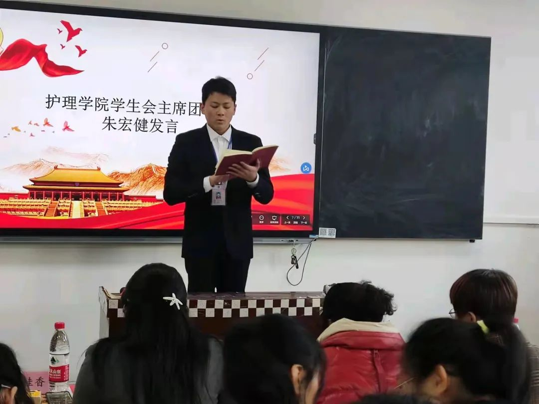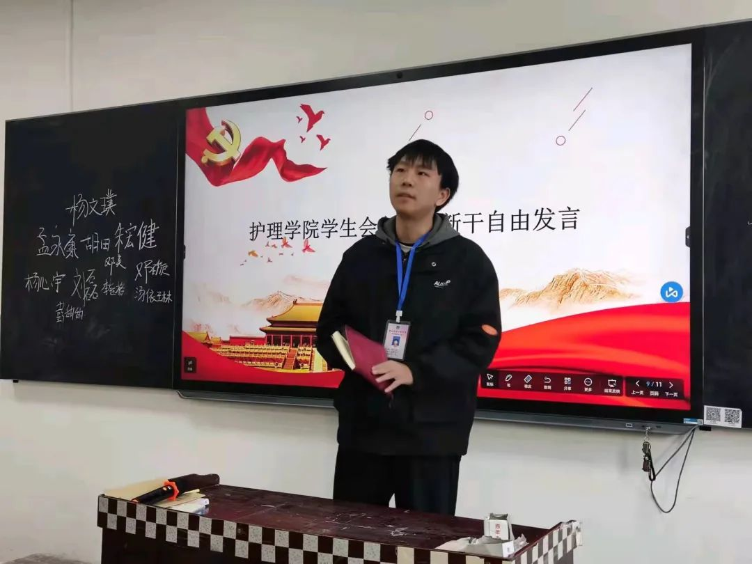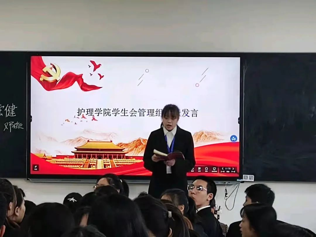 随后护理学院学生会主席团代表朱宏健、管理组代表、各部门新干、执行主席石晶进行发言,执行主席石晶就近期学生会存在的问题进行了指正。
