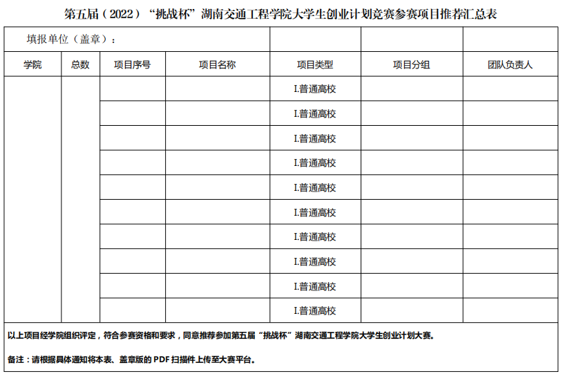 4、把握节点,及时报送。推荐校赛的作品以二级学院为单位,填写汇总表 (附件 2)统一报送,每份作品需提交项目申报表(附件 1)、项目介绍书、 项目路演 PPT 及其他证明材料。纸质档 份用档案袋标注封面报送到航母楼2006,电子版报送至:hnjtgcxytw@163.com