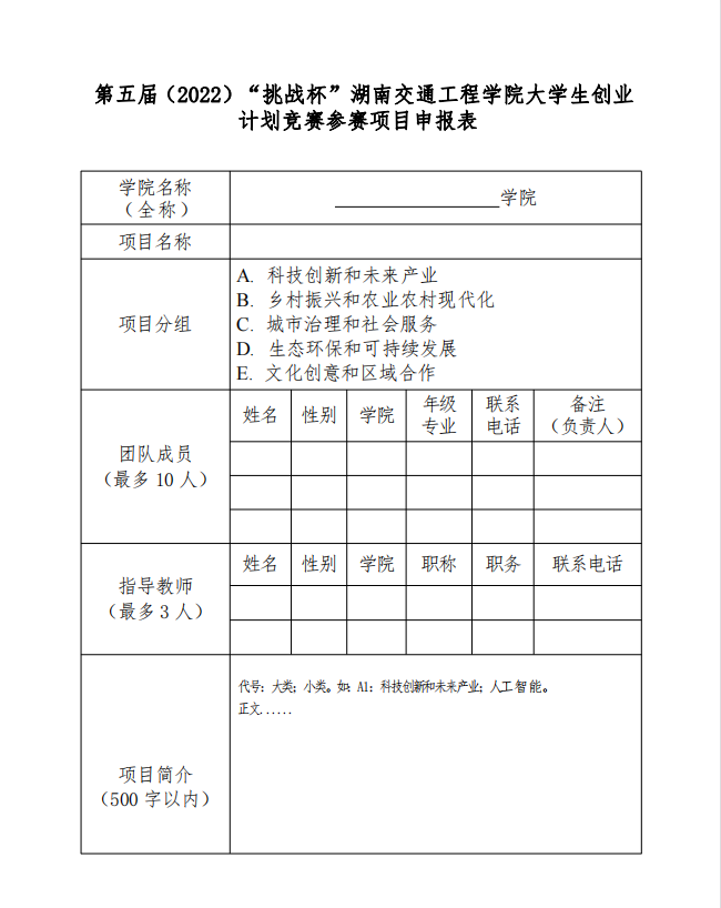 为深入学习贯彻习近平新时代中国特色社会主义思想,全面贯彻落实省 委、省政府关于大力实施创新引领开放崛起战略的部署安排,进一步聚焦 为党育人功能,引导和激励大学生通过广泛的社会实践、深刻的社会观察, 不断增强对国情社情的了解,激发创新精神,培育创业意识,提升社会化 能力,校团委、创新创业学院联合举办第五届(2022)“挑战杯”湖南交 通工程学院大学生创业计划竞赛。