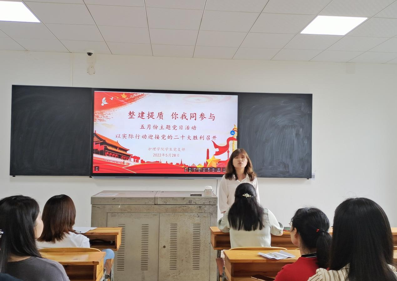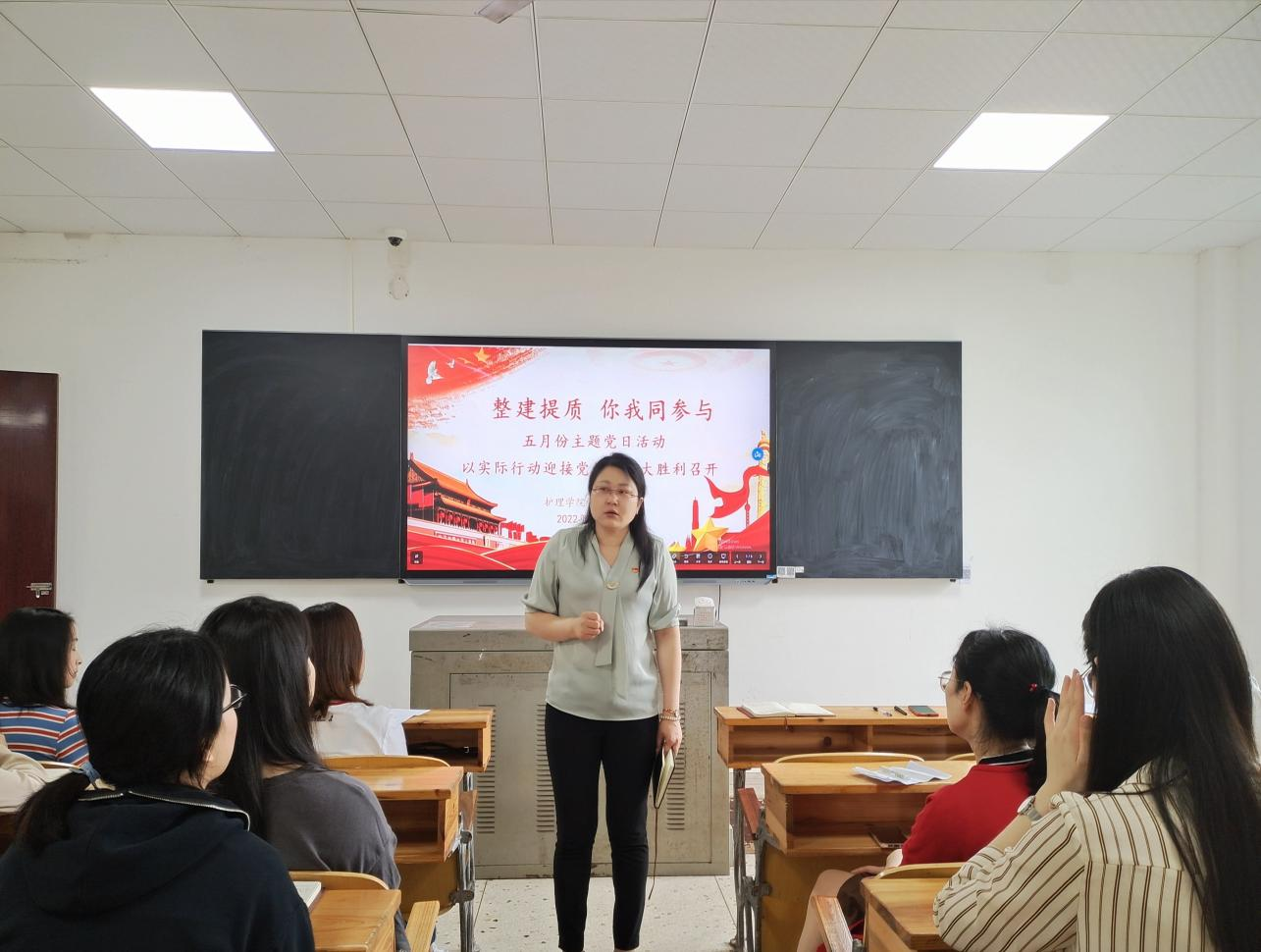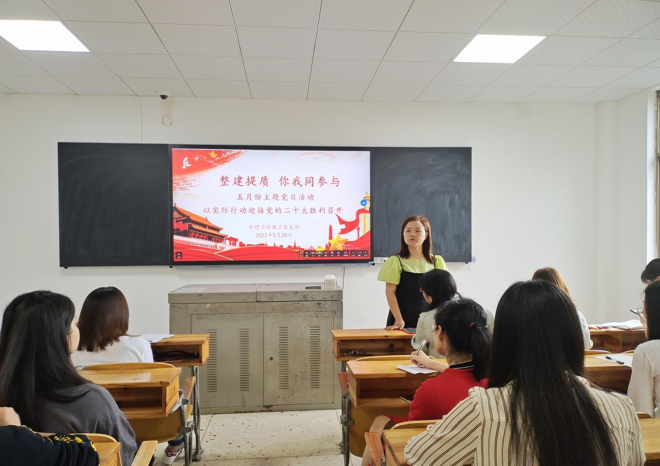 为以实际行动迎接党的二十大的顺利召开,护理学院党总支于528上午在教学楼104教室召开了以整建提质你我同参与为主题的五月份主题党日活动参加此次会议的有护理学院党总支书记邓丽、团总支书记兼党总支副书记肖桂香、教工党支部书记周艳平、学生党支部书记贺九芳14栋临时党支部书记刘梯、全体教师、学生党员。