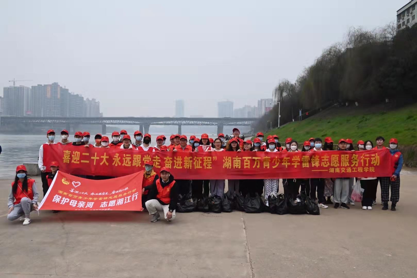 在志愿者们气势如虹,“热爱祖国、关心集体,团结同学、助人为乐,艰苦朴素、勤俭节约,刻苦学习、锐意进取!”的口号中,我们开始了今天的学雷锋志愿服务,前往湘江边沿岸开展保护母亲河,志愿湘江行活动,为环保工作献上一份力,用实际行动践行着雷锋精神。