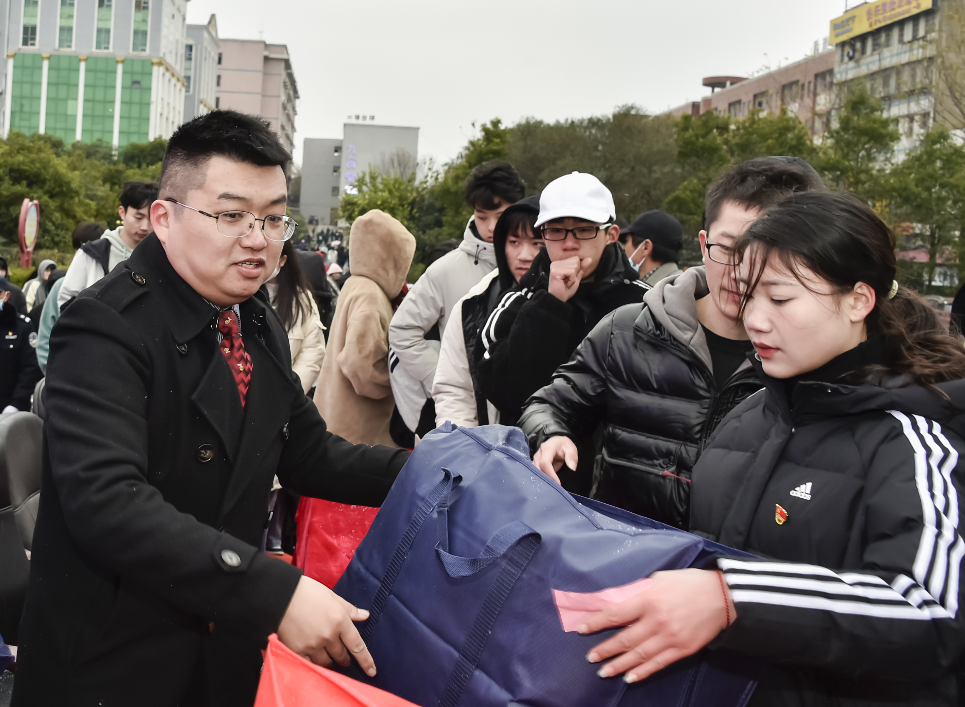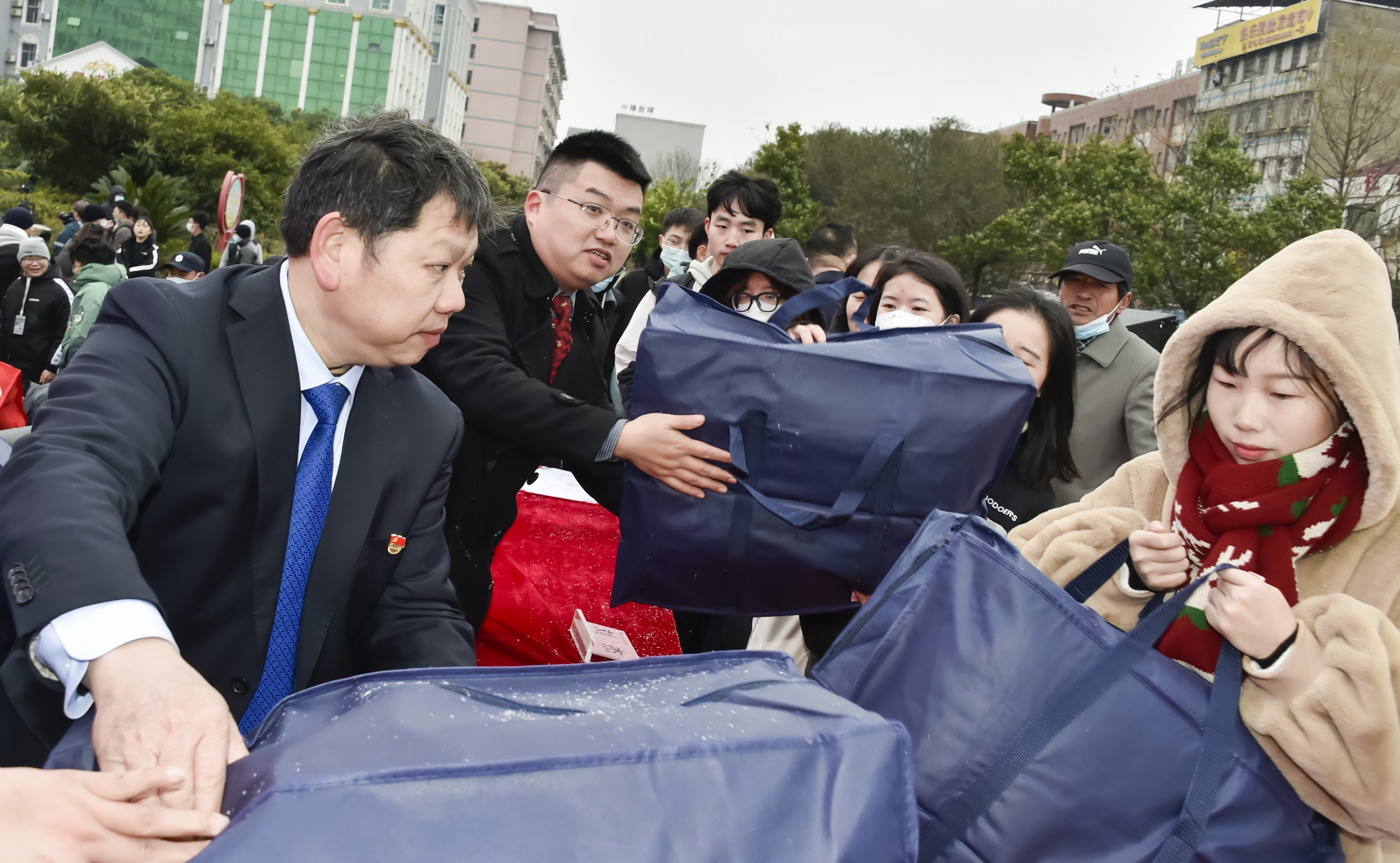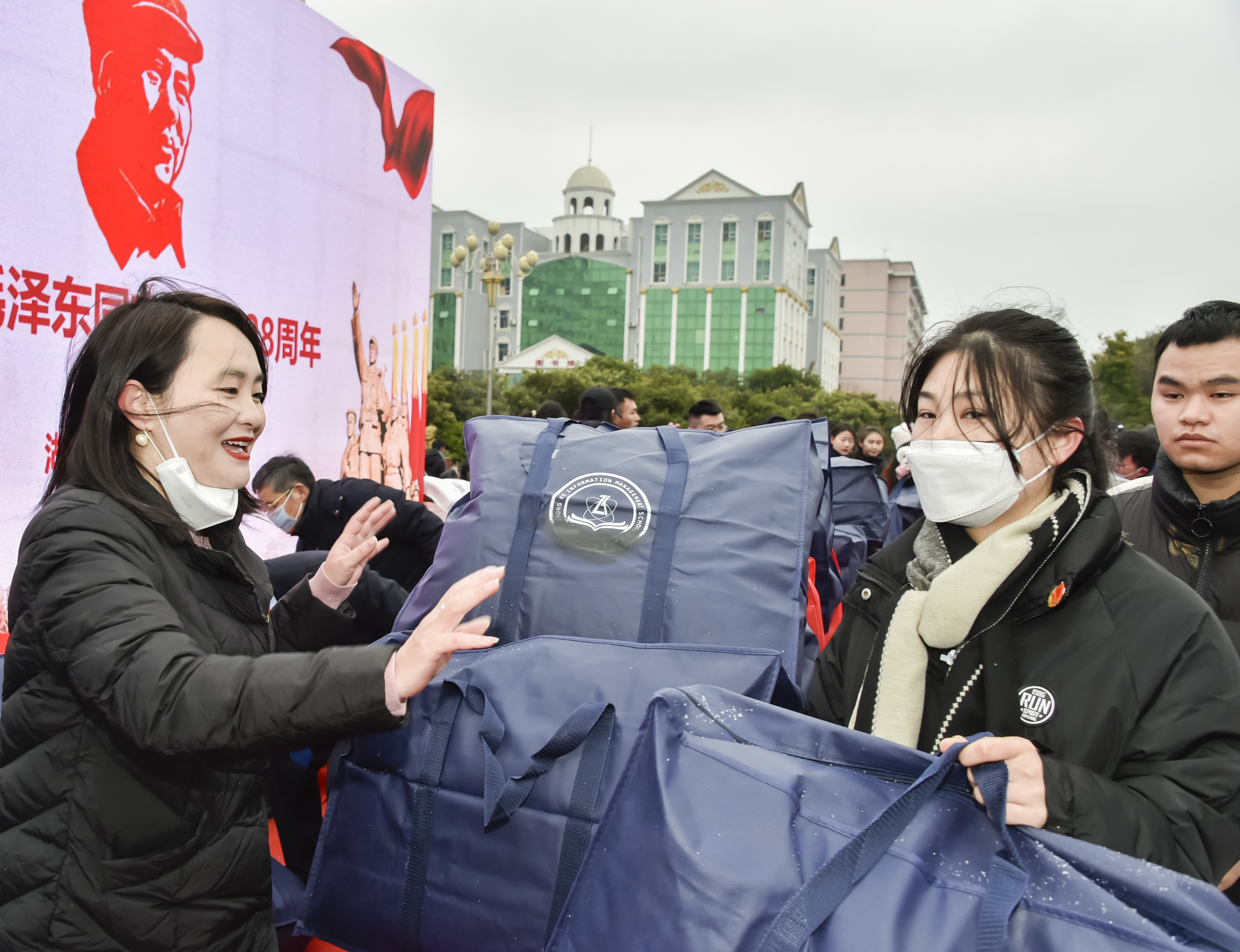 随着《爱的奉献》音乐的响起,受助学生排起了领助棉衣棉被的长龙队伍,为纪念毛泽东同志诞辰128周年纪念活动增添了爱的氛围和社会情怀场景董事长刘福生、党委书记刘文君、执行校长刘杰、名誉校长刘平娥、党委副书记李先聪、常务副校长彭文武、副校长刘初生、余孟辉,校董事董晔卉等校领导为受助学生一一发放棉衣棉被。