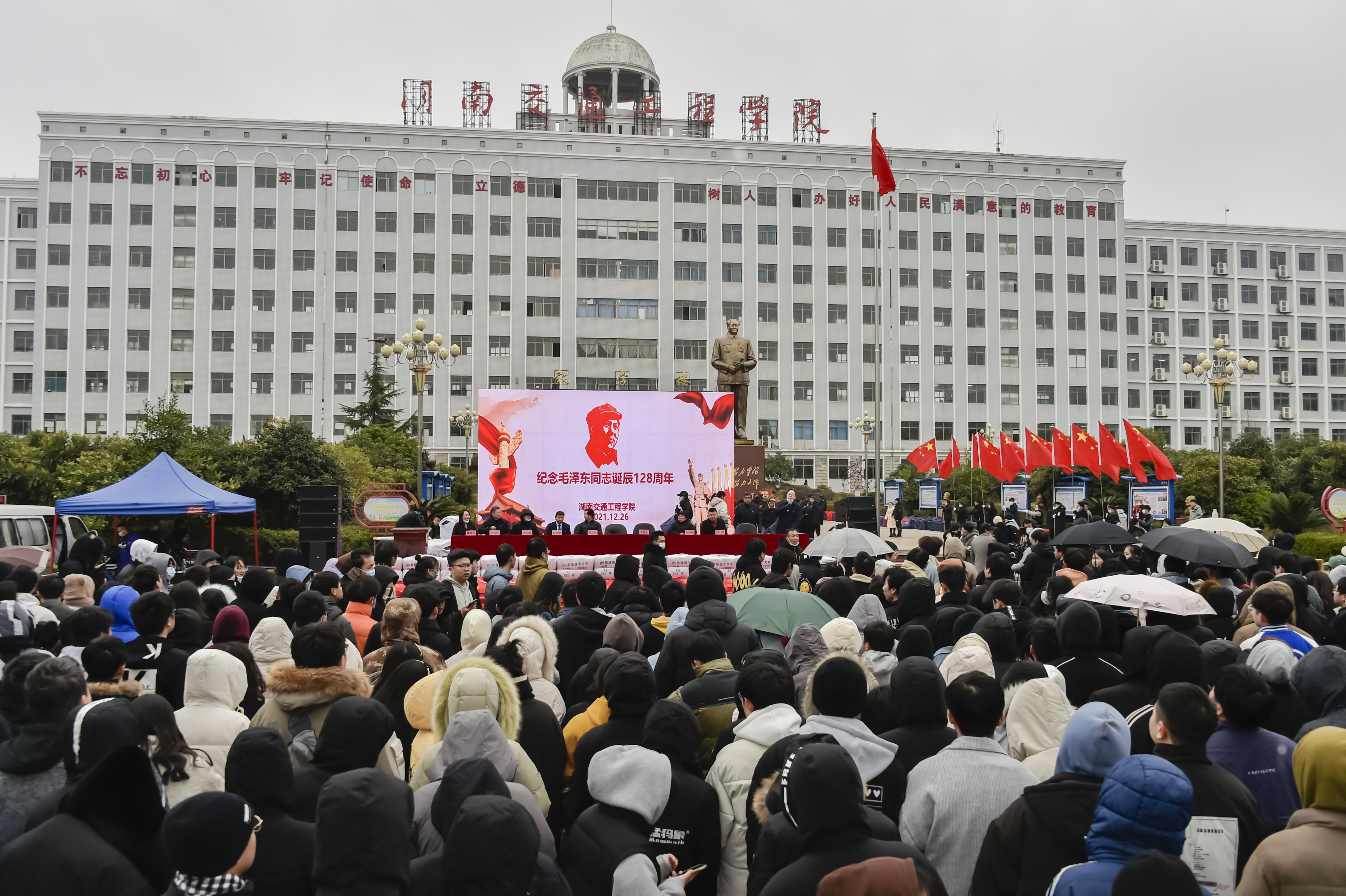 本网讯    12月26日,是毛泽东同志诞辰128周年纪念日。上午,2000余名师生在教学楼前毛泽东铜像广场隆重集会,举行纪念毛泽东同志诞辰128周年敬献花篮大型纪念活动和董事长刘福生第31次为贫困学生发放棉被棉衣捐赠活动。