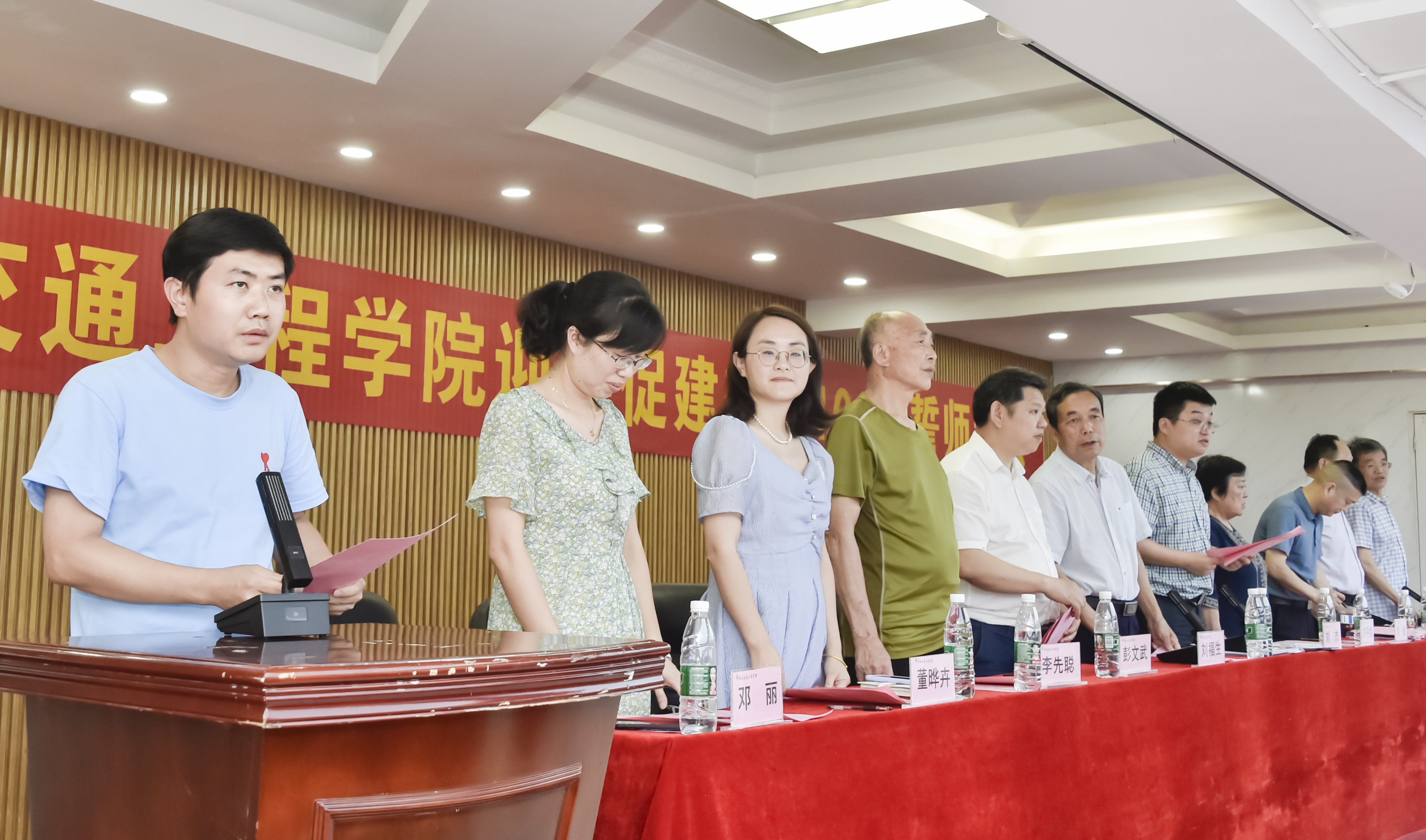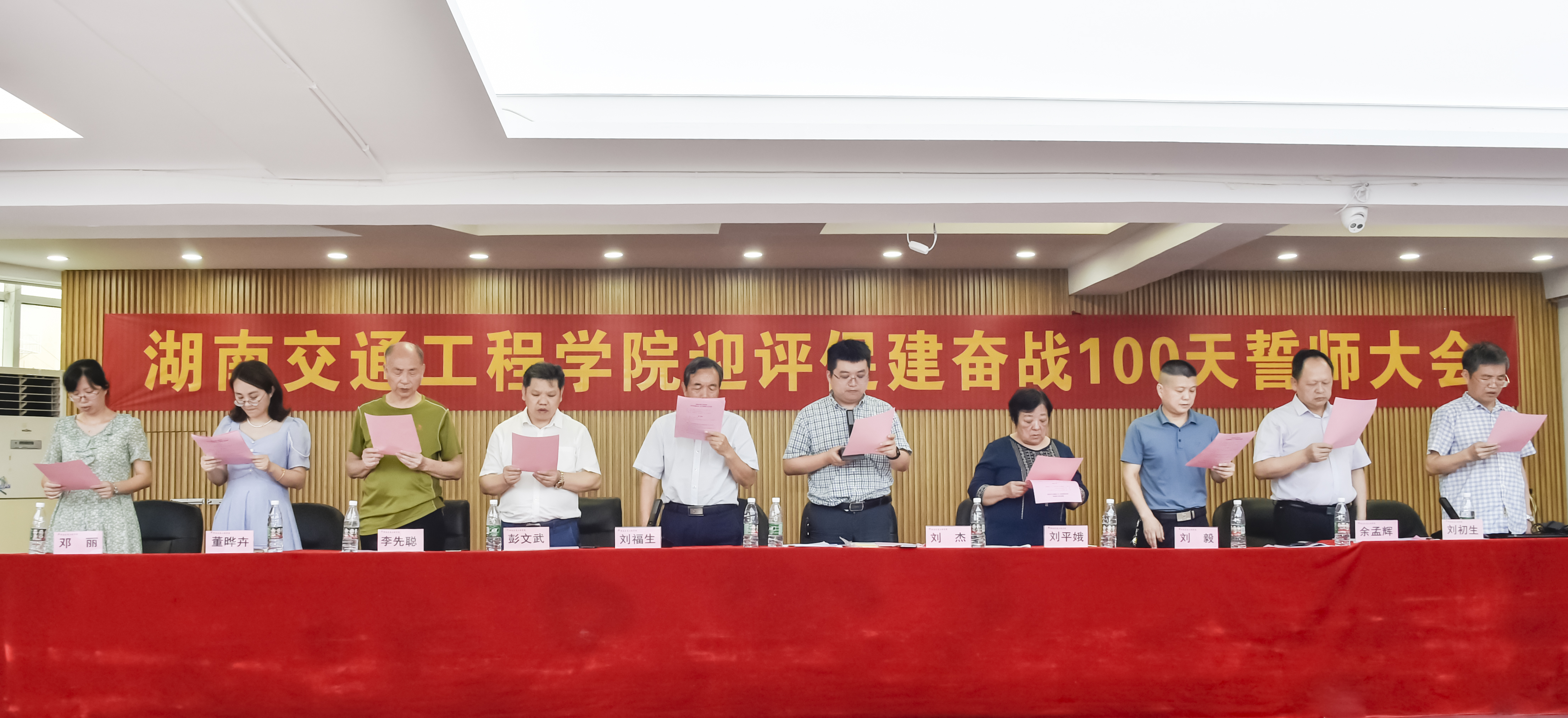 董事长刘福生代表校董事会宣读并向学校递交《本科教学工作合格评估承诺书》;副董事长、执行校长刘杰领衔校领导宣读并向学校递交《本科教学工作合格评估承诺书》;交通运输工程学院院长罗迎社领衔二级学院院长、书记宣读并向学校递交《本科教学工作合格评估承诺书》;质评中心主任肖珍领衔中层干部宣读并向学校递交《本科教学工作合格评估承诺书》;经济管理学院教师代表许芳领衔教师宣读并向学校递交《本科教学工作合格评估承诺书》;护理学院廖小立老师领衔管理人员和辅导员宣读并向学校递交《本科教学工作合格评估承诺书》;后勤处长刘国祥领衔工勤人员宣读并向学校递交《本科教学工作合格评估承诺书》。