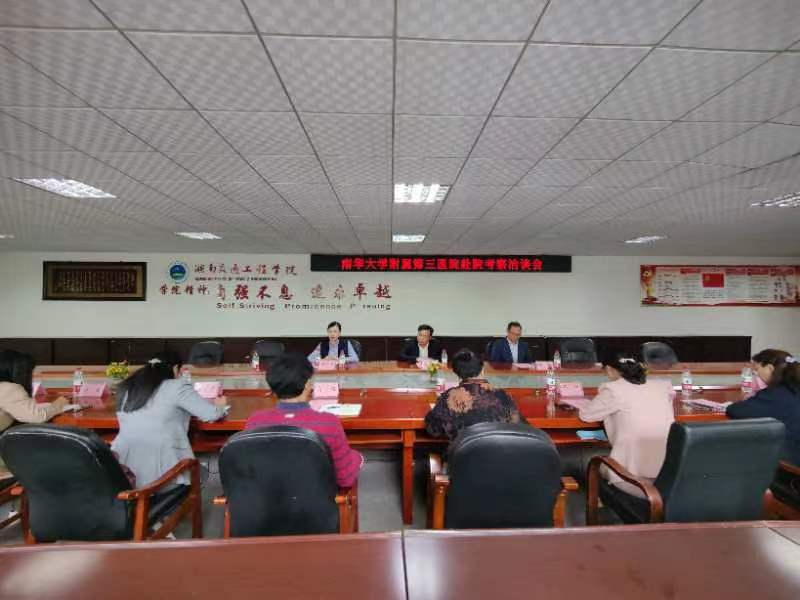 2022524日上午,南华大学附属第三医院党委书记左建宏、副院长曾健、护理部主任邓芬燕、科教科主任周蔚然一行4人来我院进行考察交流。名誉校长刘平娥、护理学院院长陈熙、党总支书记邓丽、副书记肖桂香及护理学院专业负责人等参加了座谈交流,座谈地点为护理实训楼二楼会议室,会议由党总支副书记肖桂香主持。