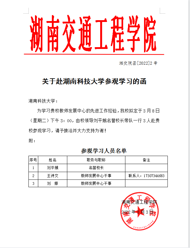 关于赴湖南科技大学参观学习的函