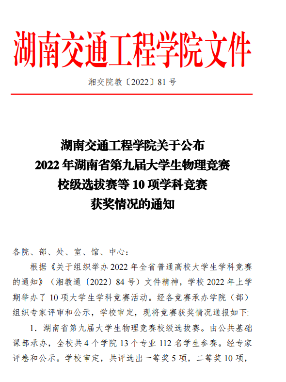 关于公布2022年湖南省大学生物理竞赛校级选拔赛等10项学科竞赛获奖情况的通知