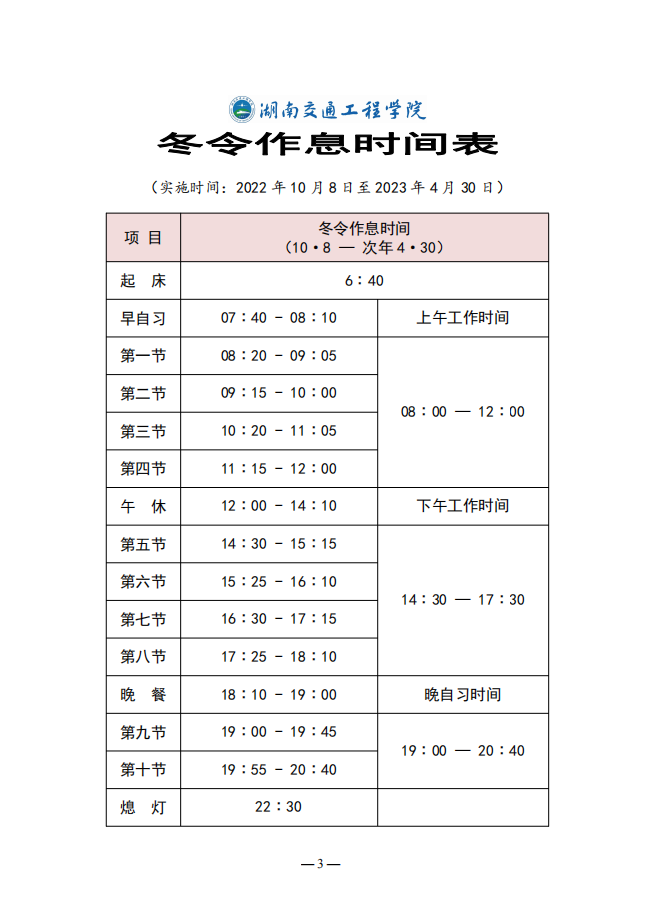 实施冬令作息时间